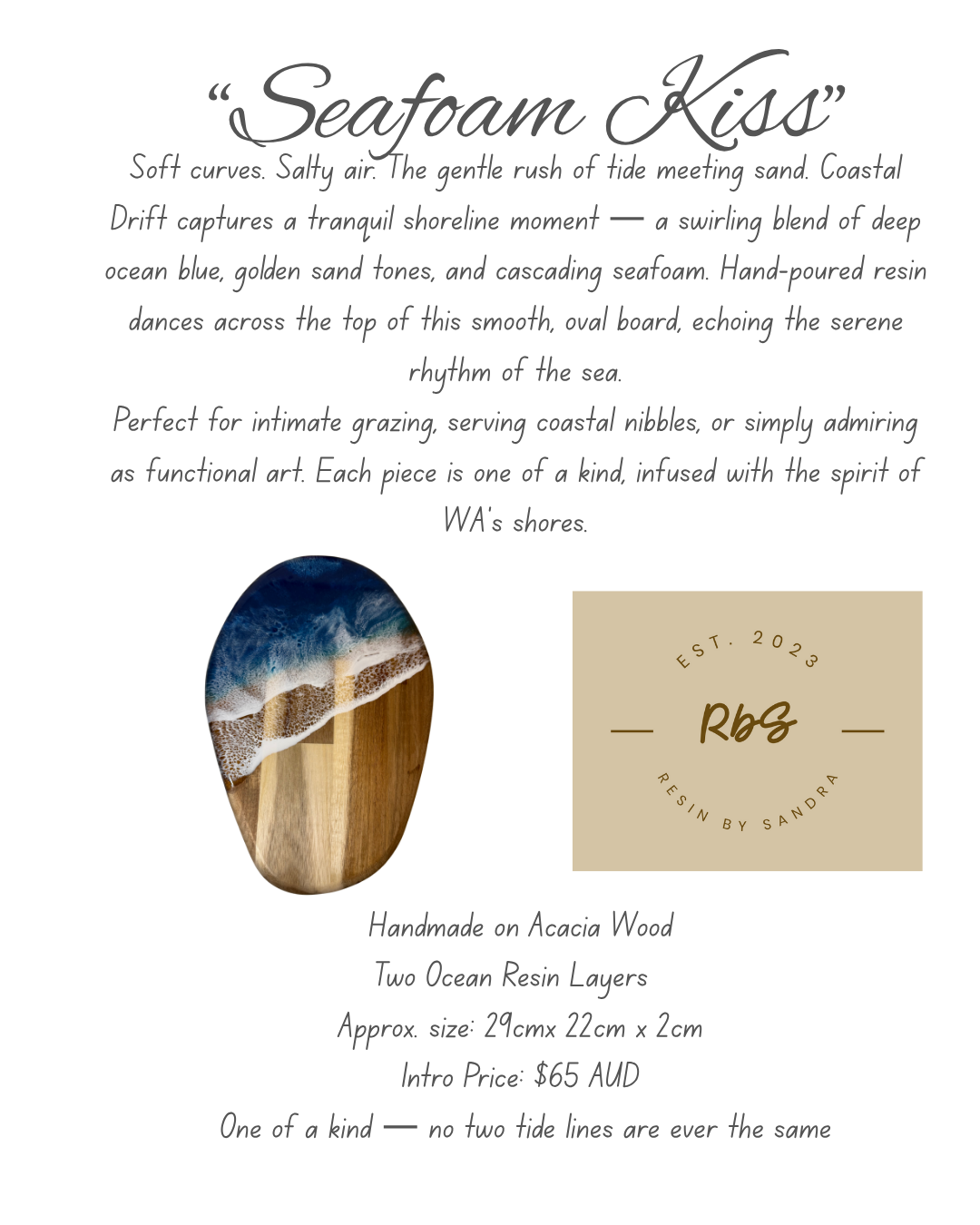 Perfect for intimate grazing, serving coastal nibbles, or simply admiring as functional art. Each piece is one of a kind, infused with the spirit of WA’s shores.