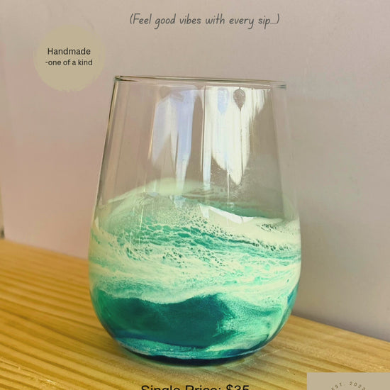 Bring the tropics to your table with this unique, hand-poured resin stemless glass. Featuring a stunning blend of deep navy blue, vibrant teal, and soft seafoam white, each glass captures the movement and magic of tropical waters.
