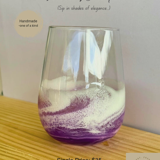 A soft cascade of violet and white resin wraps the base of this stemless glass, creating a piece that’s as elegant as it is unique. Each glass is hand-poured, so no two are ever alike — making your drinkware as individual as your taste.